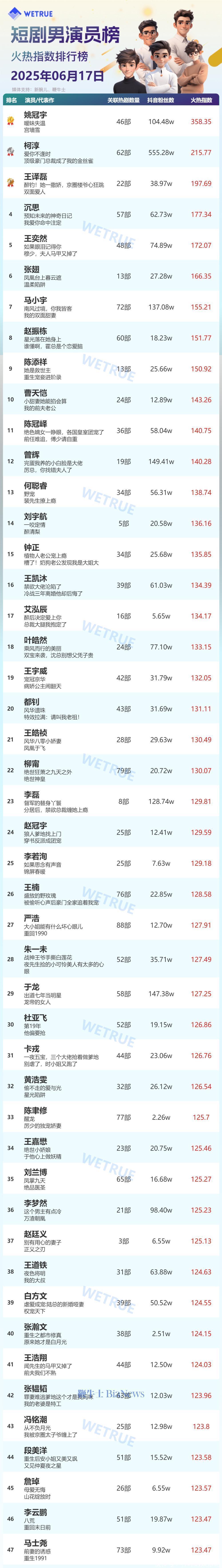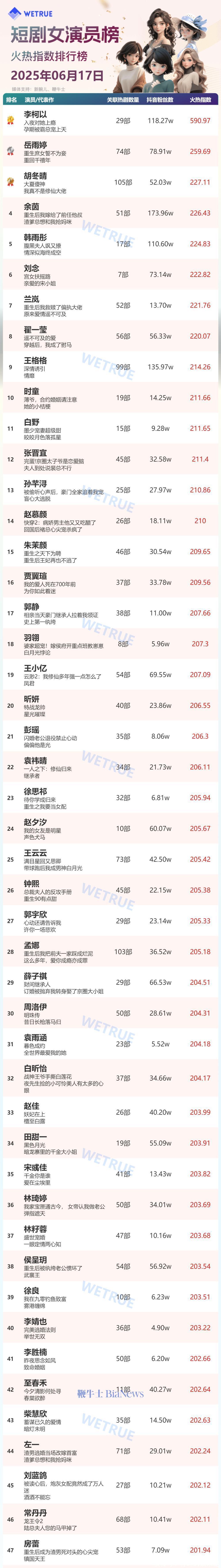 6月18日,为匡助短剧从业者提供更多信息,专注于短剧报谈的新腕儿和科技媒体鞭牛士聚首WETRUE短剧热度榜共同推出多种短剧热度榜。 本榜单为短剧女演员 男演员火热指数排名榜。 术语诠释见海报左下角。 今天发布的是6月17日榜单。