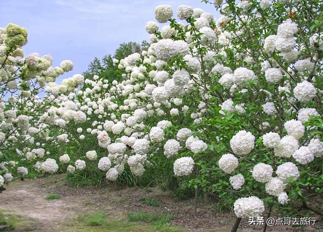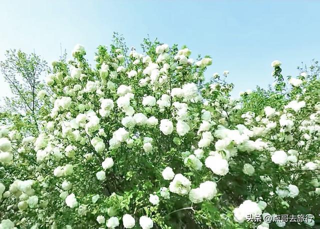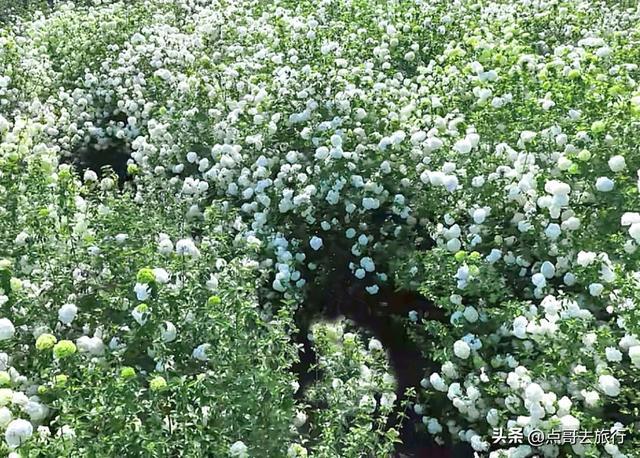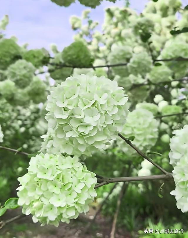 在共享木绣球赏花地之前,先了解一下什么是木绣球。木绣球,学名绣球荚蒾,古东说念主叫它绣毬,是能长到三、四米高的木本植物。当它怒放时,由成百上千朵小花攒聚而成,圆滔滔的挂在枝端,就像古代密斯抛的绣球,故而得名绣球。木绣球的花球极大,直径可达8到15厘米,致使更大,一团团、一簇簇的花球缀在枝端。木绣球花的样子,是一个渐变的历程,初开时成豆绿色或抹茶色,盛放时花色由绿转白,结净无瑕的白净,一尘不染。花瓣质感强健,如冰似玉,近闻还有一缕极淡的高雅香气。