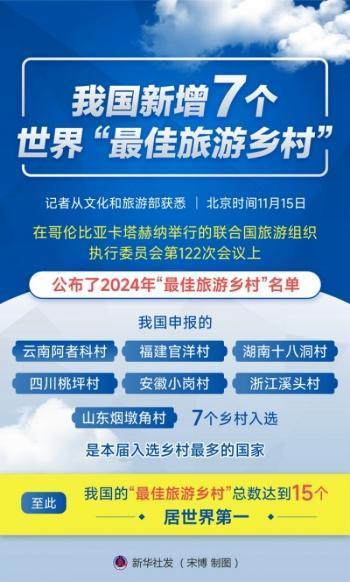 新华社北京11月15日电 记者从文化和旅游部获悉,北京工夫11月15日,在哥伦比亚卡塔赫纳举行的聚拢国旅游组织履行委员会第122次会议上,公布了2024年“最好旅游乡村”名单,我国陈述的云南阿者科村、福建官洋村、湖南十八洞村、四川桃坪村、安徽小岗村、浙江溪头村、山东烟墩角村7个乡村入选,是本届入选乡村最多的国度。