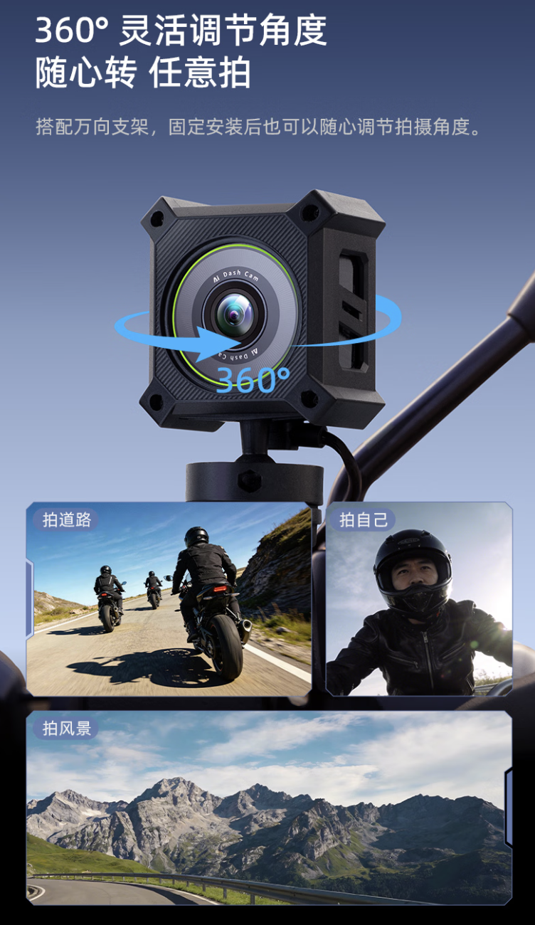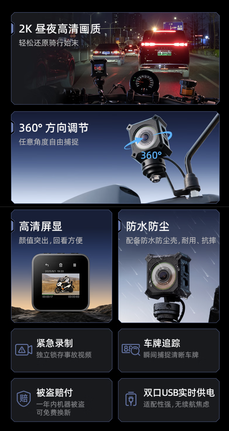 该居品适用于电动自行车 / 摩托车使用,禁受 USB 直连供电谋略(同期自带 USB 充电接口便于手机充电),其辅助 360 度万向拯救,配有防水防尘壳,内置录像头可录制 2K 辞别率视频(湮灭 146 度广角)。