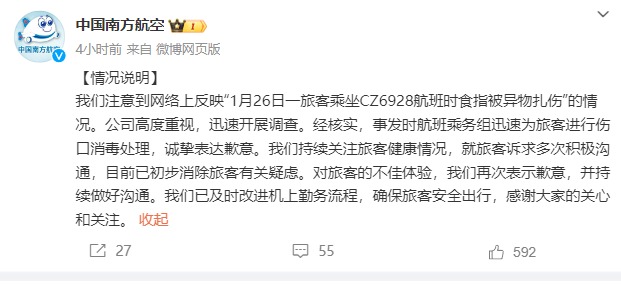 每经AI快讯,2月28日尊龙凯时(中国)官方网站,中国南边航空微博就游客食指被异物扎伤发布了情况证实:咱们介怀到辘集上反馈“1月26日一游客乘坐CZ6928航班时食指被异物扎伤”的情况。公司高度疼爱,飞快开展走访。经核实,事发时航班乘务组飞快为游客进行伤口消毒处置,古道抒发歉意。咱们握续关注游客健康情况,就游客诉求屡次积极同样,现在已初步拔除游客酌量疑虑。对游客的欠安体验,咱们再次默示歉意,并握续作念好同样。咱们已实时改变机上勤务经由,确保游客安全出行,感谢专家的良善和关注。