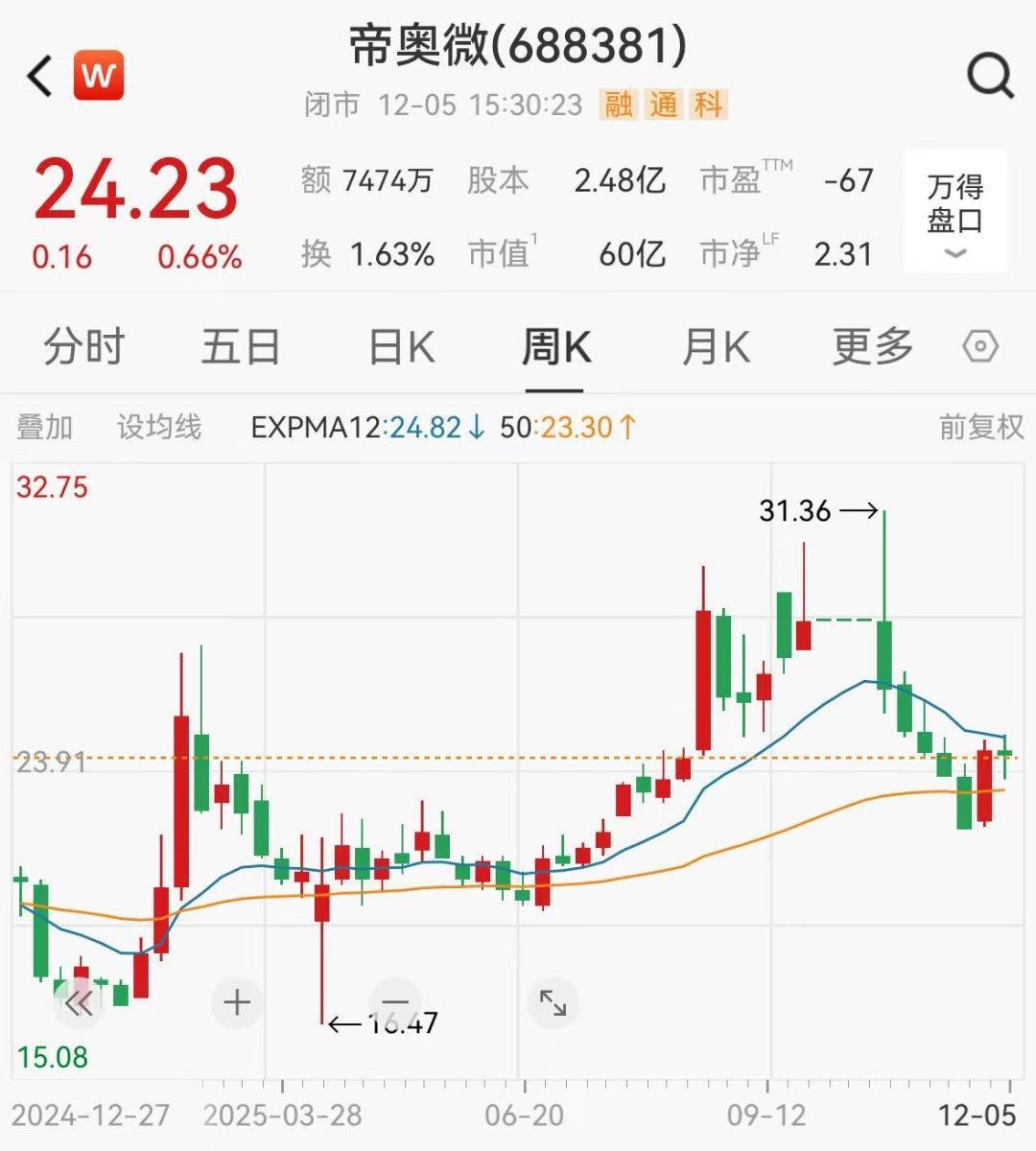 戒指12月5日收盘,帝奥微报24.23元/股,总市值60亿元。